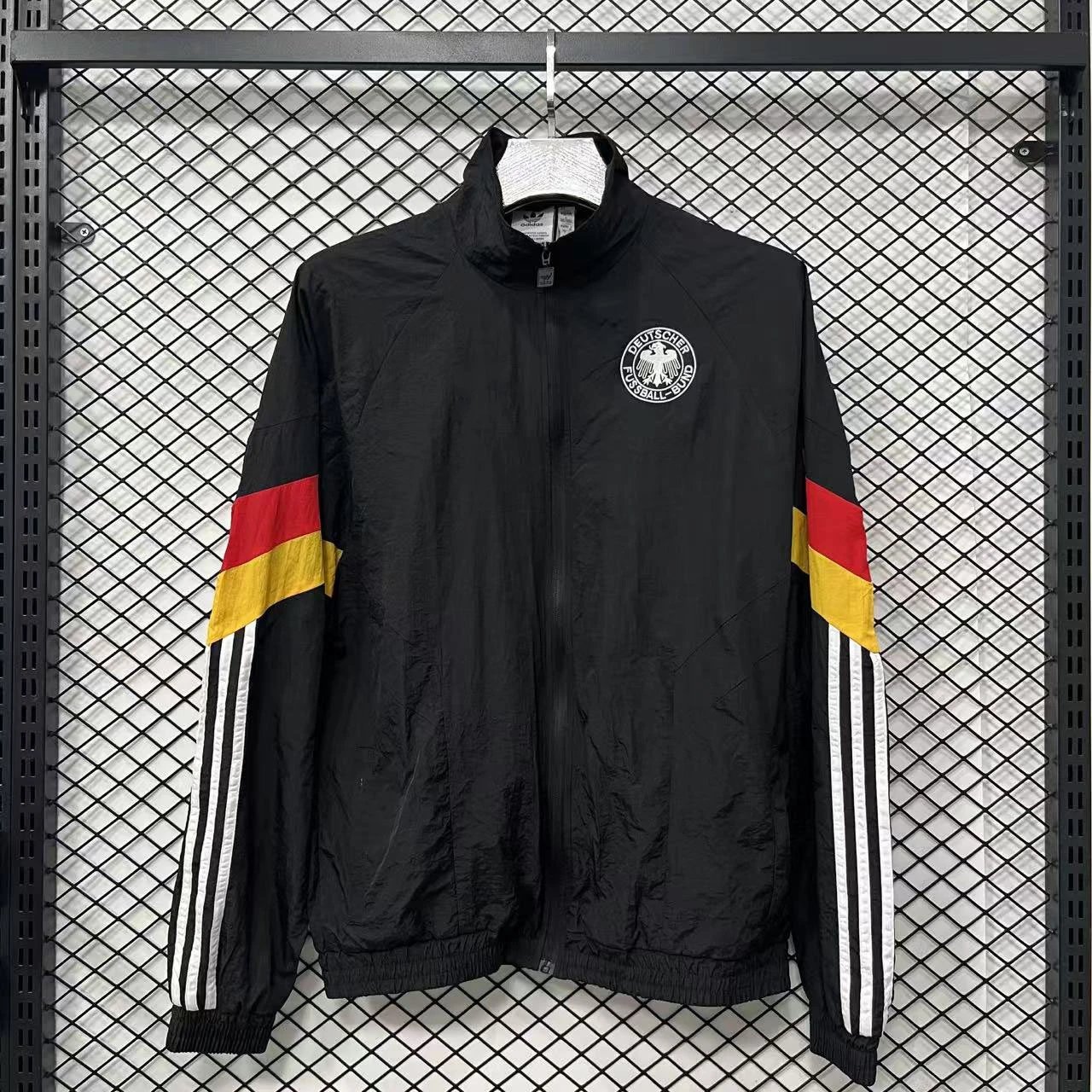 Adidas Germany Team Soccer Jacket in Black: German athletic aesthetics meet streetwear trends. Classic black body accented with iconic team details, sharp silhouette for athletic lines, windproof fabric balancing functionality and style. Pair with workwear pants and dad sneakers for everyday street style. Stand out at soccer matches or urban commutes—a must-have for football fans and fashion enthusiasts this fall/winter.