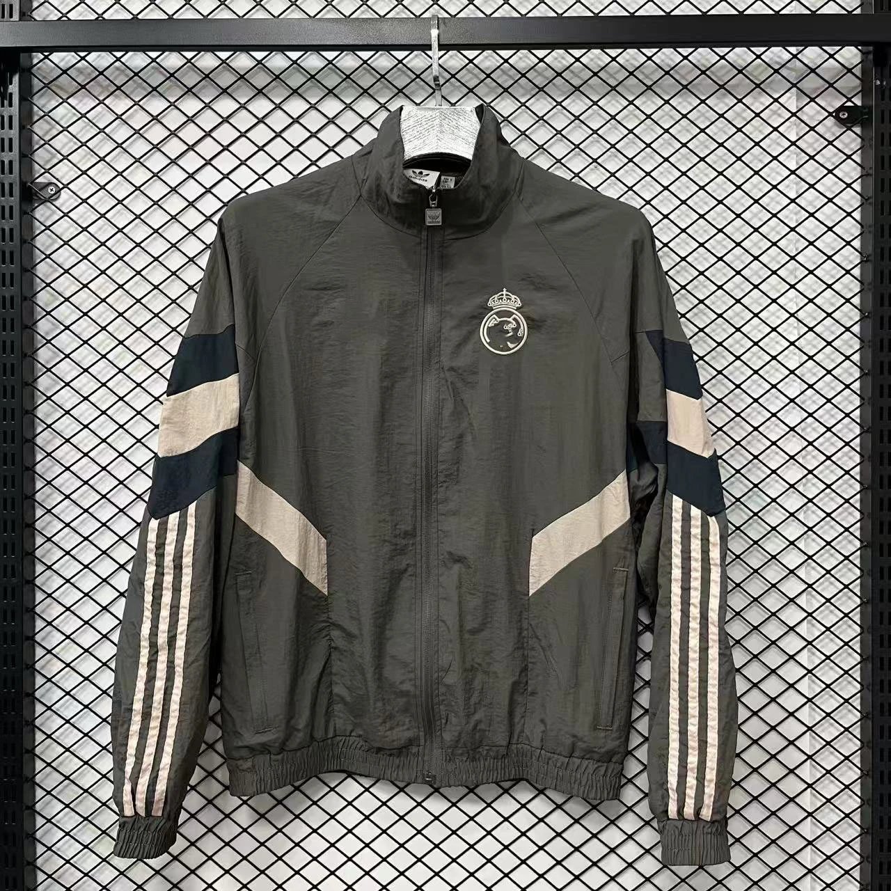 Adidas Real Madrid Collaboration Military Green Sports Jacket blends street-cool with athletic functionality. The vintage military green hue exudes understated sophistication. Pair it with jeans or tapered pants for everyday wear, and add dad sneakers or athletic shoes for an instant eye-catching look. Clean lines meet windproof fabric, while ribbed cuffs enhance practicality for comfortable, relaxed wear. A must-have for Real Madrid fans, this versatile piece effortlessly adapts to any occasion, showcasing a bold, street-savvy attitude.