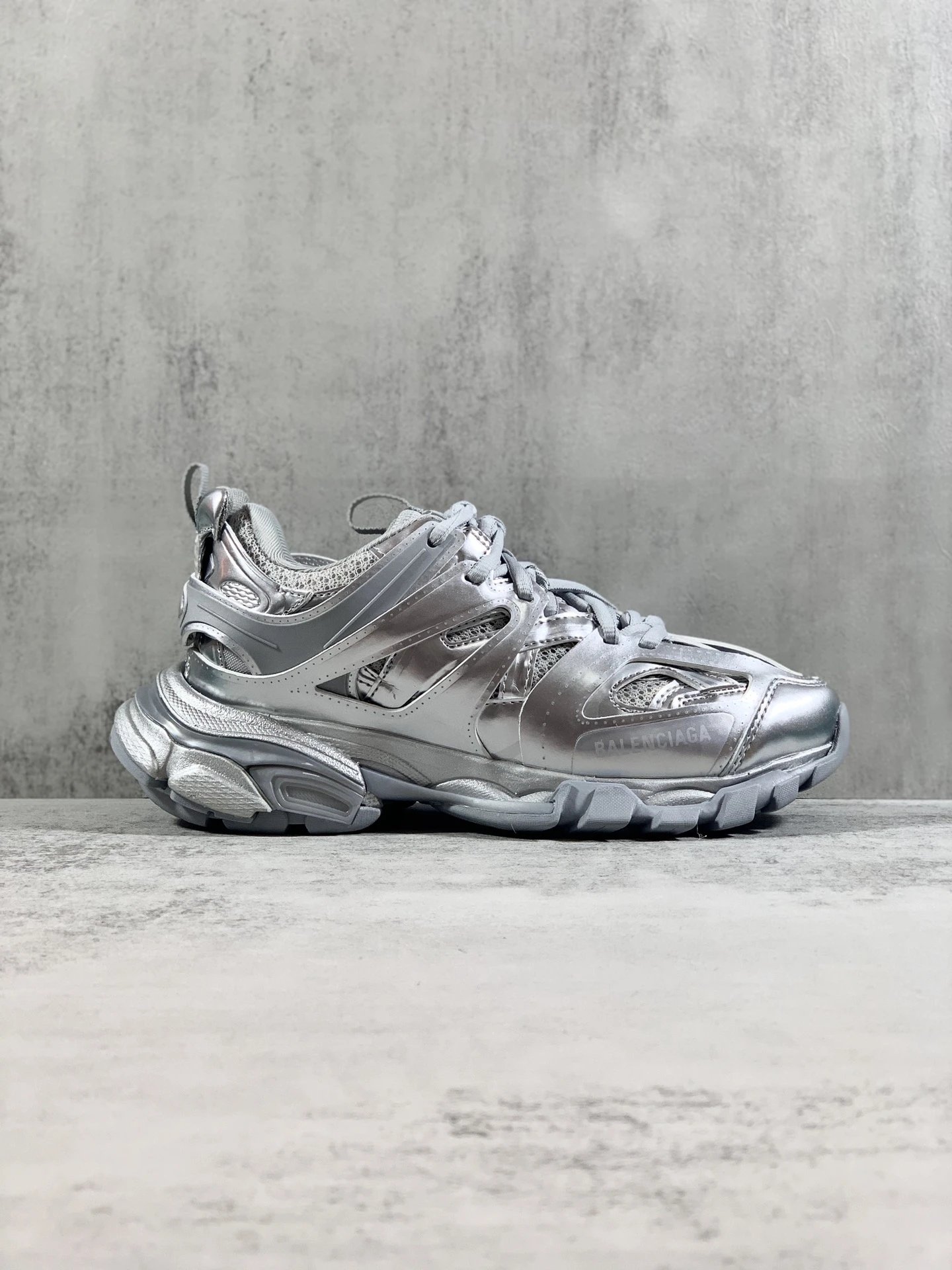 Balenciaga Track Silver Sneakers: Futuristic tech-inspired design meets metallic silver sheen, with a layered upper sculpting an avant-garde silhouette. Seamlessly transitions from everyday streetwear to athletic wear, this cult-favorite sneaker makes a comeback. Effortlessly unlock high-street eye-catching looks, defining your personal style with avant-garde flair.
