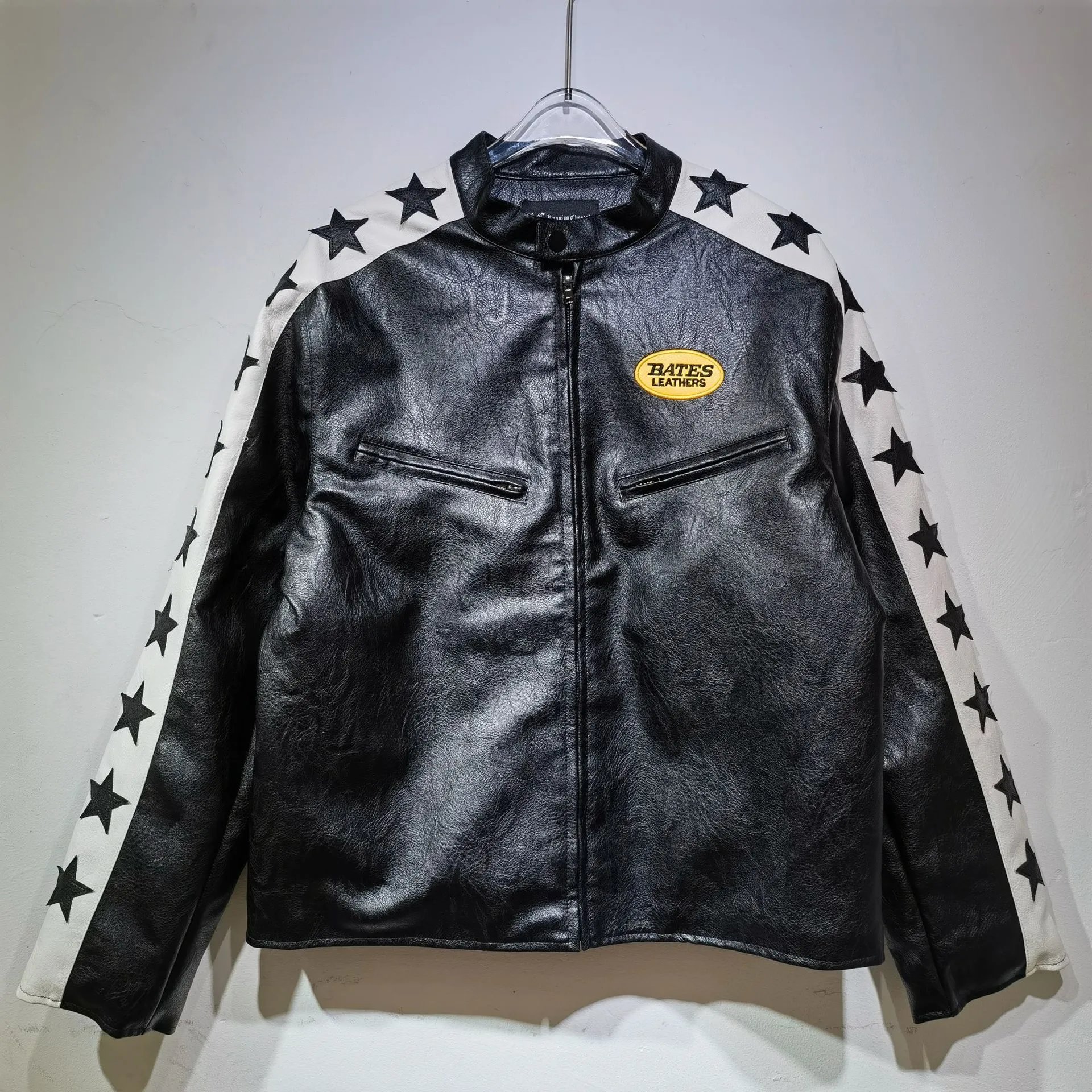 Hardcore BATES black leather jacket in biker style. Classic stand-up collar + metal zipper design. Structured silhouette flatters the figure. Premium PU leather ensures durability and longevity. Pair with jeans/workwear pants for versatile looks, layer over a hoodie to instantly become a street-savvy trendsetter. Effortlessly create high-street dark-themed outfits for daily commutes or weekend outings. A must-have for trendsetters, this wardrobe staple unlocks versatile styling inspiration.