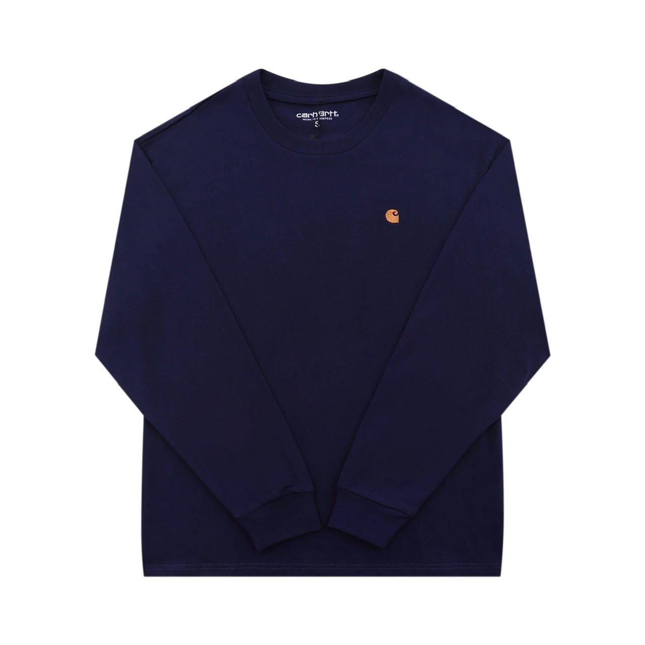 Carhartt Classic Workwear Long-Sleeve T-Shirt, a must-have for American streetwear enthusiasts. Featuring a minimalist navy blue design with the iconic small chest label, this piece belongs to the WIP Classic Basics collection. Crafted from 180g combed cotton, it offers softness against the skin, breathability, and durability, effortlessly blending workwear style with everyday casual wear. A wildly popular brand favorite, this piece garners praise for its exceptional quality and versatile appeal, making it a practical and stylish must-have for fall/winter wardrobes.