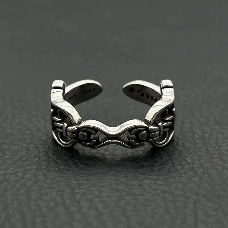 Chrome Hearts Cross Ring – Hand-chiseled from 925 silver, the roughly aged surface is encrusted with cracks in 50k gold. The corners of the cross pierce the rules, refracting a dark edge as it spins.