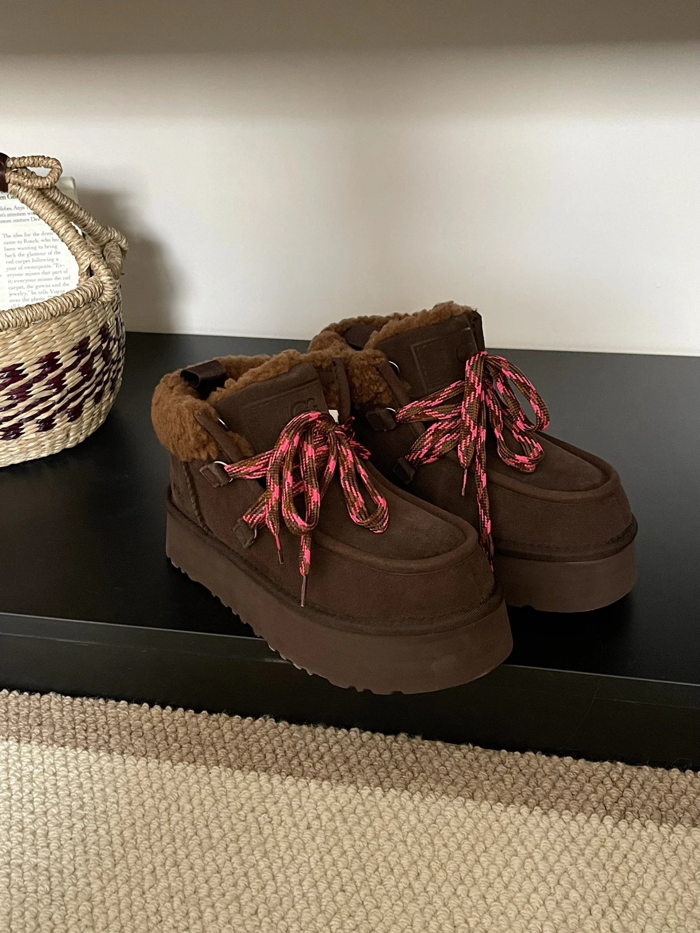 This UGG Focala lace-up slip-on features a classic brown design that’s both stylish and versatile, perfect for multiple occasions. Its unique lacing design not only adds dimension to the shoe but also allows for customizable fit based on individual foot shape, ensuring all-day comfort. The upper is crafted from premium materials that feel soft to the touch yet offer durable wear. The sole incorporates anti-slip technology for enhanced safety and stability while walking. Whether paired with casual wear or formal attire, these loafers showcase distinctive taste and style.”