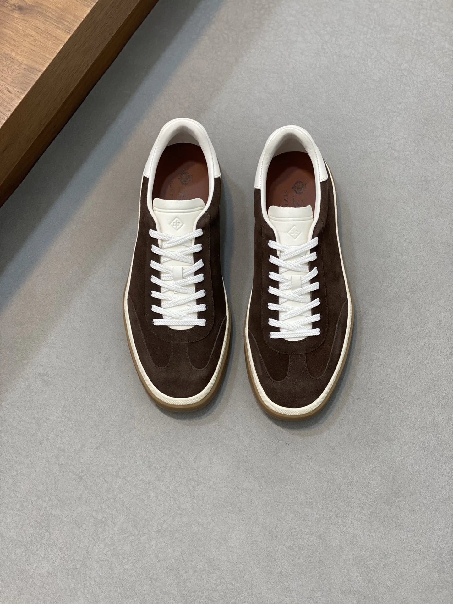 Loro Piana Lace-Up Coffee Brown Leather Outdoor Casual Shoes. Crafted from premium coffee brown leather, these shoes boast not only exceptional texture but also outstanding durability and water resistance, effortlessly handling the challenges of diverse outdoor environments. The upper features a refined lace-up design, allowing for easy adjustment while adding a touch of style. The outsole utilizes high-elasticity rubber, delivering superior traction and cushioning for stable, comfortable strides. Whether strolling along forest trails or navigating city streets, these shoes are your indispensable leisure companion.