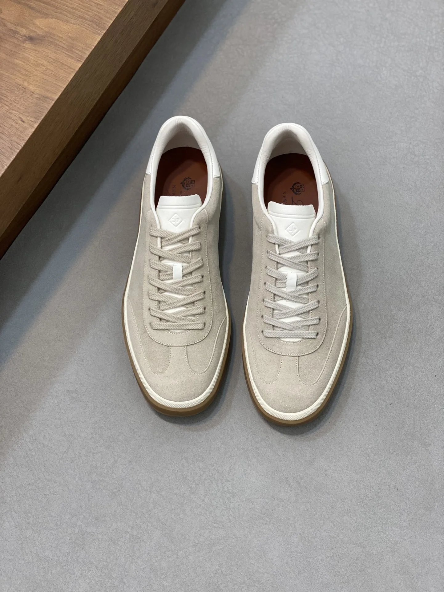 Loro Piana Lace-Up Grey Cowhide Outdoor Casual Shoes are crafted from high-quality grey cowhide, offering a refined texture and exceptional durability. The lace-up design not only adds a vintage touch but also allows for customizable fit according to individual foot shape, ensuring comfort during wear. The sole utilizes a special material providing excellent slip resistance and abrasion resistance, delivering stable support and outstanding traction whether strolling city streets or enjoying light outdoor hikes. The overall style is casual yet fashionable, pairing effortlessly with everyday outfits for versatile occasions.