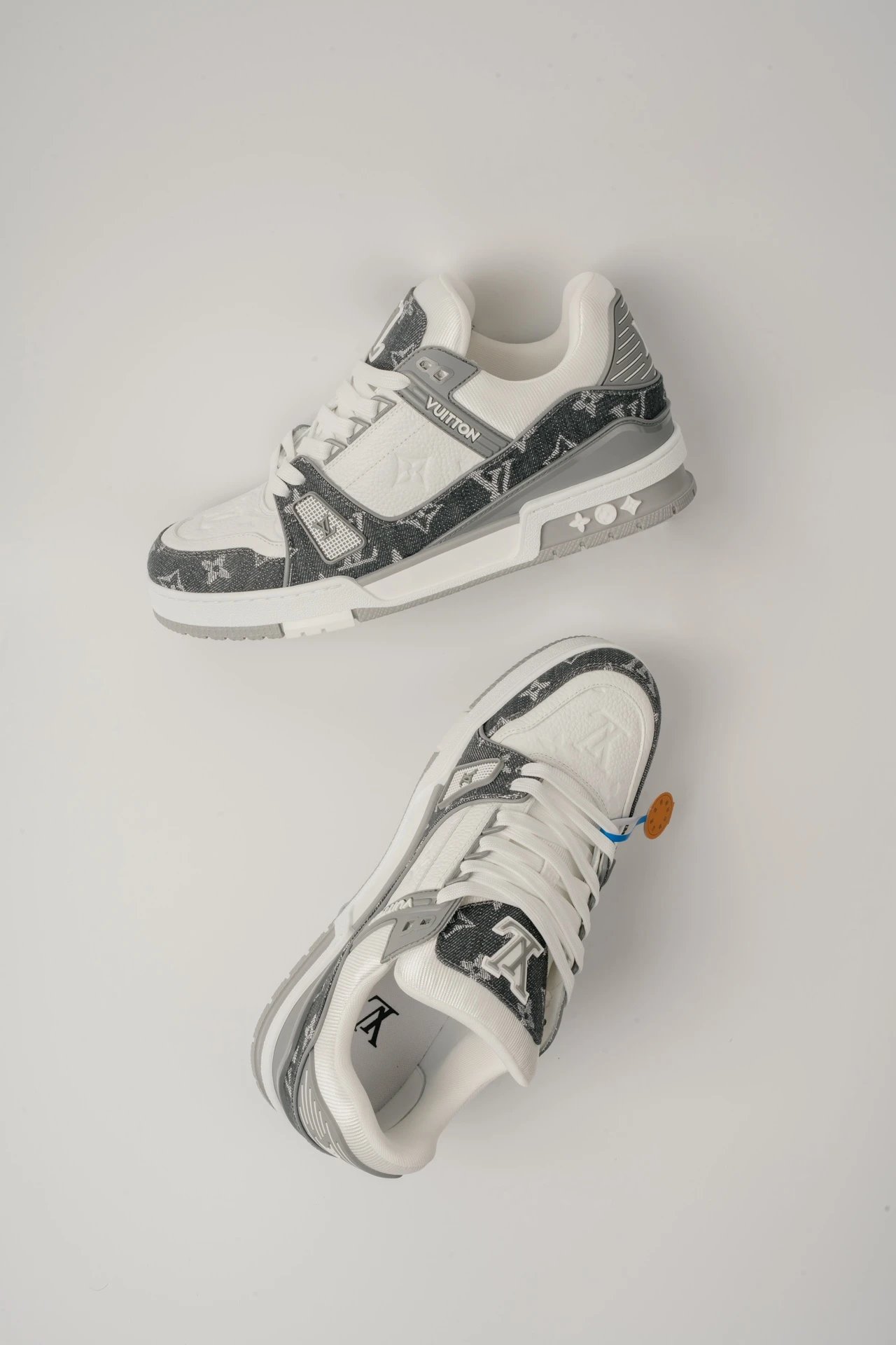 LV Trainer Trendy White-Gray Sneakers: Defining street aesthetics with a gradient white-gray color clash. Retro athletic silhouettes meet high-street sophistication. Effortlessly pair with relaxed sweatpants, denim jackets, or workwear sets for everyday outings or trendy parties. Embody your unique, edgy style with this must-have sneaker for creating eye-catching looks.