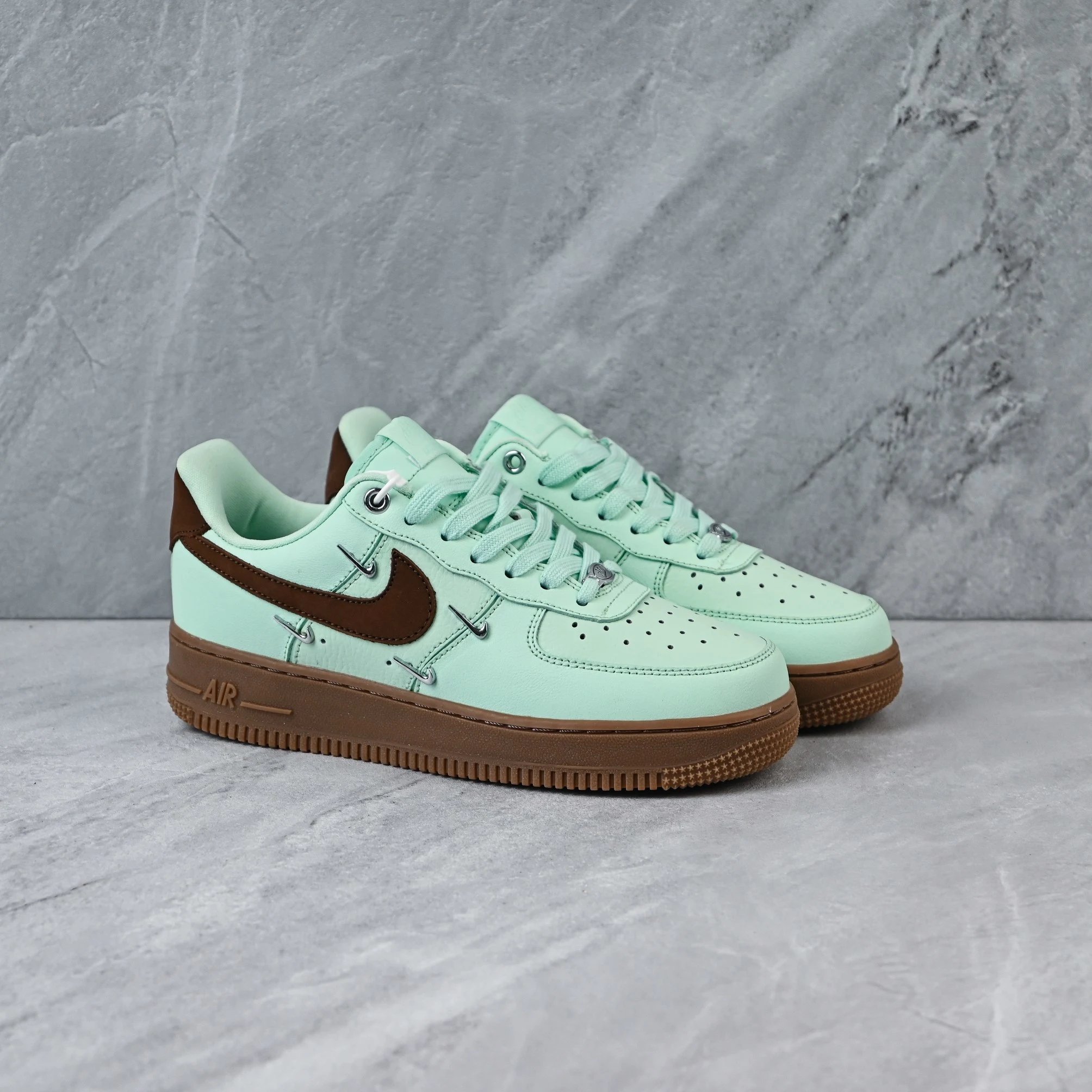 This Nike Air sneaker features a fresh, light green hue as its primary color, paired with a brown sole and the iconic Nike Swoosh for a minimalist, stylish design. The upper incorporates breathable perforations to ensure all-day comfort, while the sole prominently displays the “Air” logo and incorporates Nike’s patented Air cushioning technology for exceptional shock absorption.