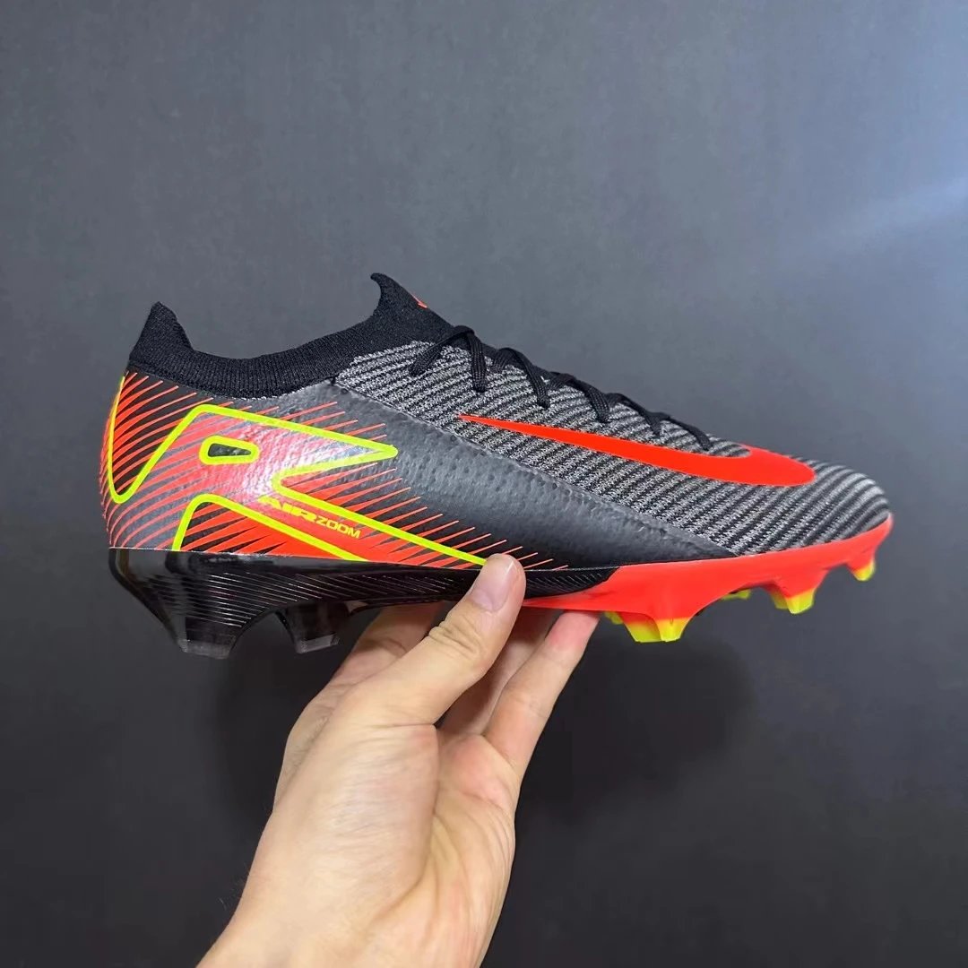 Nike’s Mercurial Series Soccer Cleats in Black and Red Colorway This pair of Nike Mercurial soccer cleats features a classic black and red color scheme with striking visual impact. The upper predominantly showcases black, accented by red lines that outline a dynamic silhouette, exuding both speed and style. The outsole incorporates red accents that echo the overall design, making them stand out vividly on the pitch. The unique textured pattern not only enhances traction but also lends a futuristic, high-tech aesthetic.