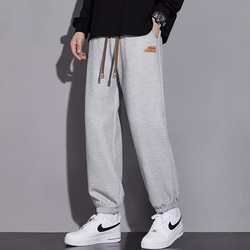 Pants Streetwear Loose Fit Series Light Gray Cuffed Casual Pants. Centered on street-chic aesthetics, the light gray hue offers timeless versatility. The relaxed silhouette accommodates diverse body types. A brown drawstring with metal buckle at the waist allows for customizable fit, while tapered cuffs create a clean, sharp finish that accentuates an effortlessly cool vibe. Subtle side labels add a touch of refined detail within minimalist design. Crafted from skin-friendly knit fabric, it offers breathability, softness against the skin, and resistance to deformation for unrestricted comfort in daily wear. Effortlessly pair with hoodies, tees, or jackets to create a laid-back yet attitude-driven street look. With its comfortable fit and trendy design, it has become a go-to choice for young trendsetters in their daily outings, consistently gaining attention in the casual wear scene and embodying a carefree lifestyle aesthetic.