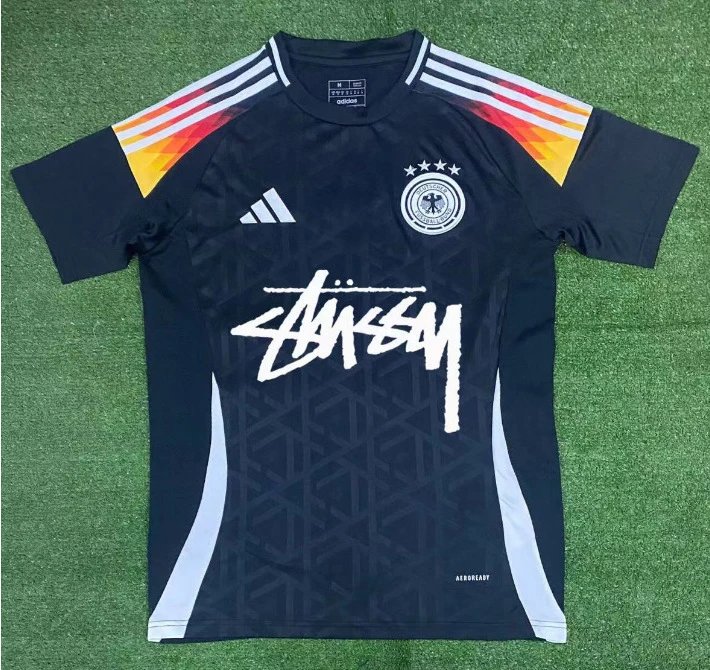 Stussy x Adidas Germany Team Collaboration Collection Midnight Black Gradient Stripe Street Graffiti Sports Jersey. The iconic Stussy handwritten graffiti signature on the chest is eye-catching, while the classic Adidas three stripes on the shoulders feature an orange-yellow gradient, paired with the Germany team’s four-star emblem to highlight the collaborative identity. Geometric jacquard patterns add dimensional texture, while white side panels define the silhouette. The athletic cut ensures a comfortable, form-fitting wear. Crafted from quick-dry, breathable fabric, it seamlessly blends streetwear’s effortless attitude with football’s dynamic energy—perfect for both everyday wear and athletic pursuits. This cross-dimensional piece, buzzing among trendsetters, effortlessly showcases an unrestrained, avant-garde style.