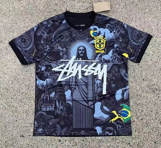 Stussy Brazil Cultural Totem Series Black Printed Short-Sleeve T-Shirt. A black base showcases rich totem motifs, featuring a central Christ the Redeemer statue alongside Brazilian landmarks. The “BRASIL” emblem and subtle accents of the yellow, blue, and green national flag colors are complemented by the Stussy handwritten logo spanning the front for enhanced brand recognition. Where streetwear meets regional cultural symbols, intricate totem patterns showcase a distinctive aesthetic. Breathable fabric suits summer daily wear, while bold color contrasts heighten visual impact. With its rich cultural heritage and iconic design, it has become a coveted summer piece among streetwear enthusiasts, maximizing trend recognition and effortlessly expressing individual attitude.