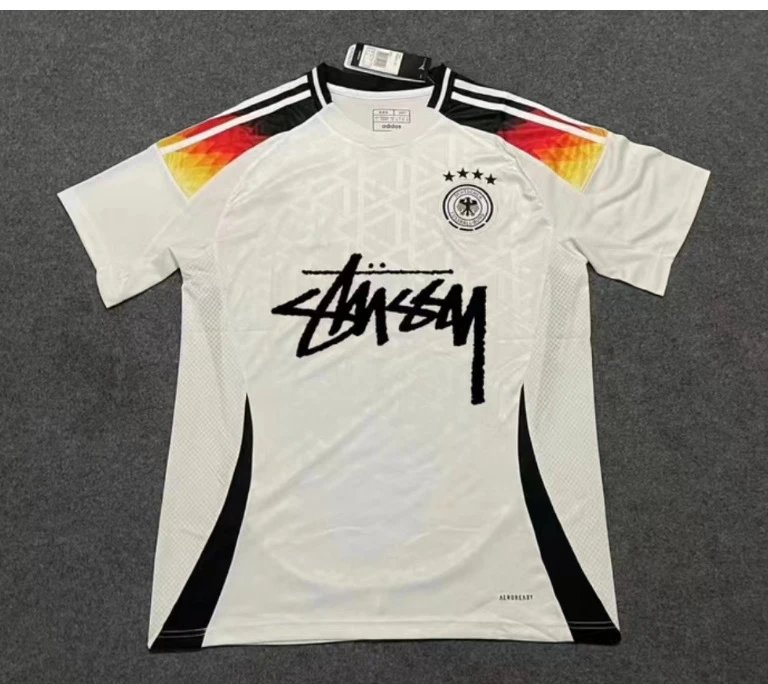Stussy x Germany National Team Collaboration: Black & White Contrast Streetwear Jersey. The iconic handwritten graffiti logo on the chest injects street DNA, while shoulder stripes in red, black, and yellow gradient echo classic tricolor elements. The central shield emblem with four-star design enhances recognition. Crafted from breathable mesh fabric for a cool, comfortable feel, black side panels define the athletic silhouette, and the crew neck offers a clean, versatile fit. Blending street graffiti art with athletic jersey silhouettes, the white base contrasts sharply with black and red accents for bold visual impact. Whether cruising the streets or attending trend-setting gatherings, this piece effortlessly commands attention as a buzzed-about crossover sportswear item, embodying an unconventional attitude toward style.