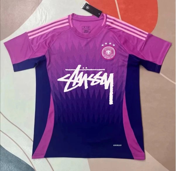 Stussy Gradient Purple-Blue & Pink Streetwear Sports Jersey. A classic purple-blue gradient base blends with pink side stripes, while diamond-patterned subtle textures on the body add depth. The iconic handwritten graffiti logo on the chest stands out, complemented by star badges for a retro athletic vibe. Three pink stripes on the sleeves echo its sports heritage, and the breathable, quick-dry fabric suits both everyday wear and light workouts. The slightly tapered hem creates a clean, streamlined silhouette, while the solid-color back contrasts visually with the front. As a popular staple in streetwear circles, its bold color blocking and signature brand elements make it a go-to choice for trendsetters seeking effortless style. It masterfully blends American streetwear and athletic leisure aesthetics, earning widespread favor among young fashion enthusiasts.