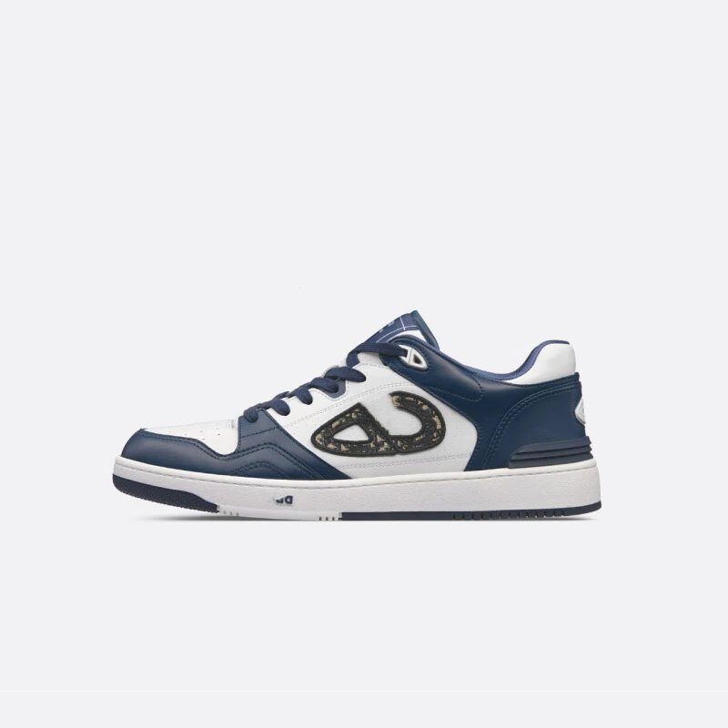 Iconic elements: the upper is crafted from cowhide leather.: The upper is made from head-layer cowhide leather with three-dimensional embroidered Dior logo, continuing the brand’s classic jacquard process?The side panels are printed in blue and white jacquard fabric with suede inserts, enhancing the overall sense of sophistication.