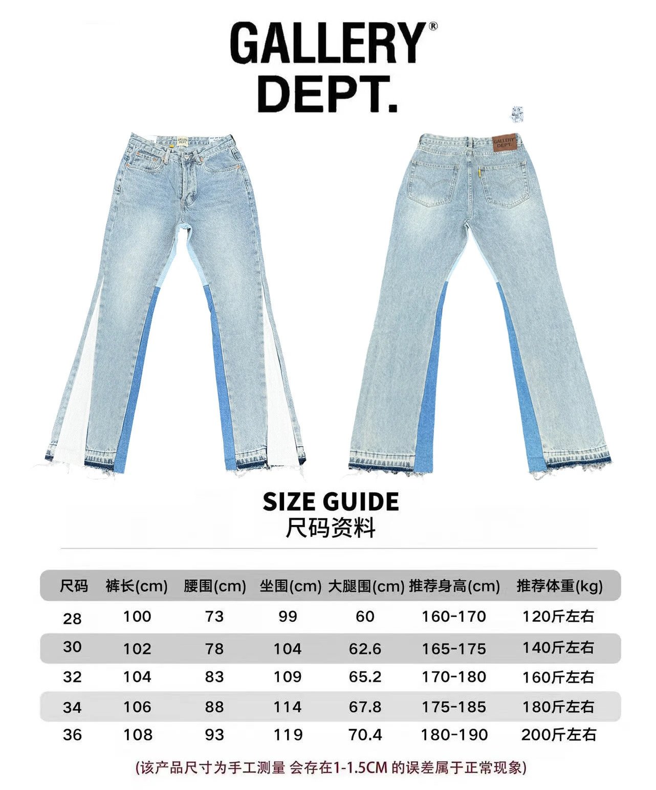 Gallery Dept. Light Blue Patchwork Bell-Bottom Pants: Redefining retro streetwear with high-street flair. A light blue base meets bold patchwork details, while the subtle flare elongates the legs for a slimming, heightening effect. Distressed frayed edges add an extra touch of laid-back texture. Pair effortlessly with cropped hoodies, oversized tees, or loose shirts, and slip into retro sneakers or chunky dad sneakers for a laid-back, chic look. Embracing the retro revival trend, this essential piece lets trendsetters make a statement while staying practical.