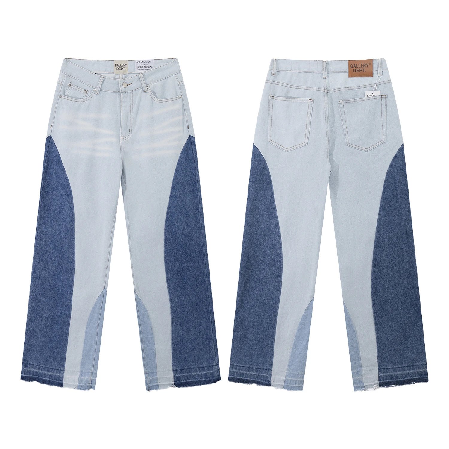 Gallery Dept Patchwork Blue Wide-Leg Jeans: Vintage street-inspired patchwork design with distressed blue tones that make a statement. The relaxed wide-leg cut elongates and slims the silhouette, pairing perfectly with cropped hoodies, biker jackets, or oversized coats. Step out in dad sneakers for ultimate street-chic. High-street deconstruction meets retro revival elements—a must-have statement piece for trendsetters.