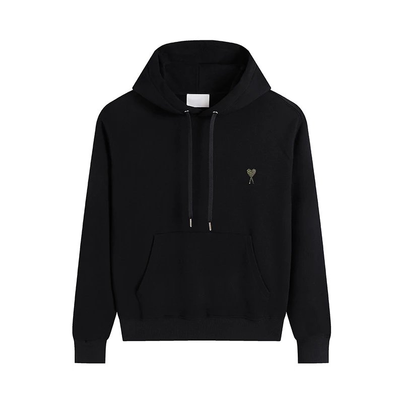 Heart-Print Black Hoodie: Street-Chic Design! Classic black base accented with a bold heart print. Hooded drawstring + relaxed fit ensures comfort and style. Effortlessly styled for daily outings or casual commutes, this is a must-have for fall/winter 2024 trendsetters. Unlock your unique streetwear attitude!