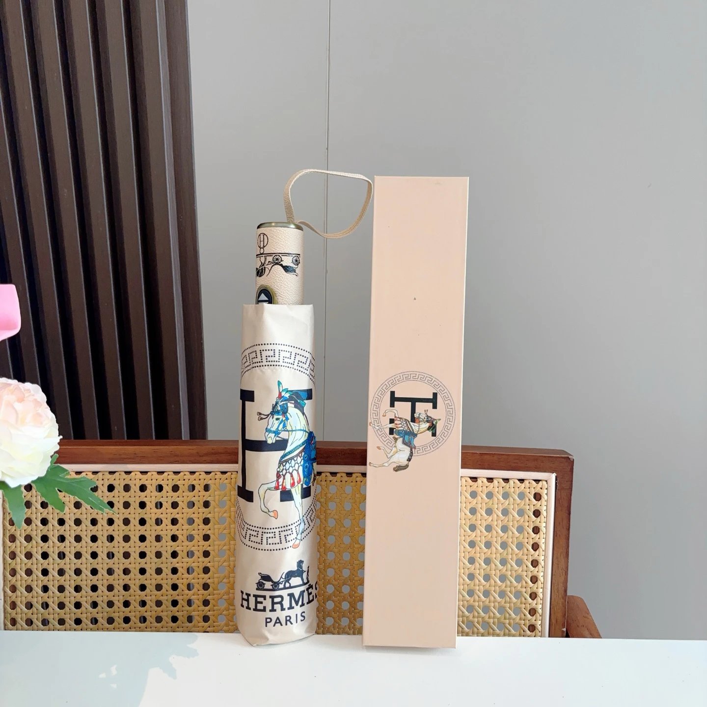Hermès Vintage Print Umbrella in Beige: A soft beige canopy adorned with classic vintage prints exudes French elegance. Perfect for daily outings, commutes, or afternoon dates, this lightweight, portable accessory elevates any look with timeless sophistication. Crafted with Hermès’ signature artisanal expertise, it blends practicality and aesthetics, infusing both rainy and sunny days with retro-modern charm.