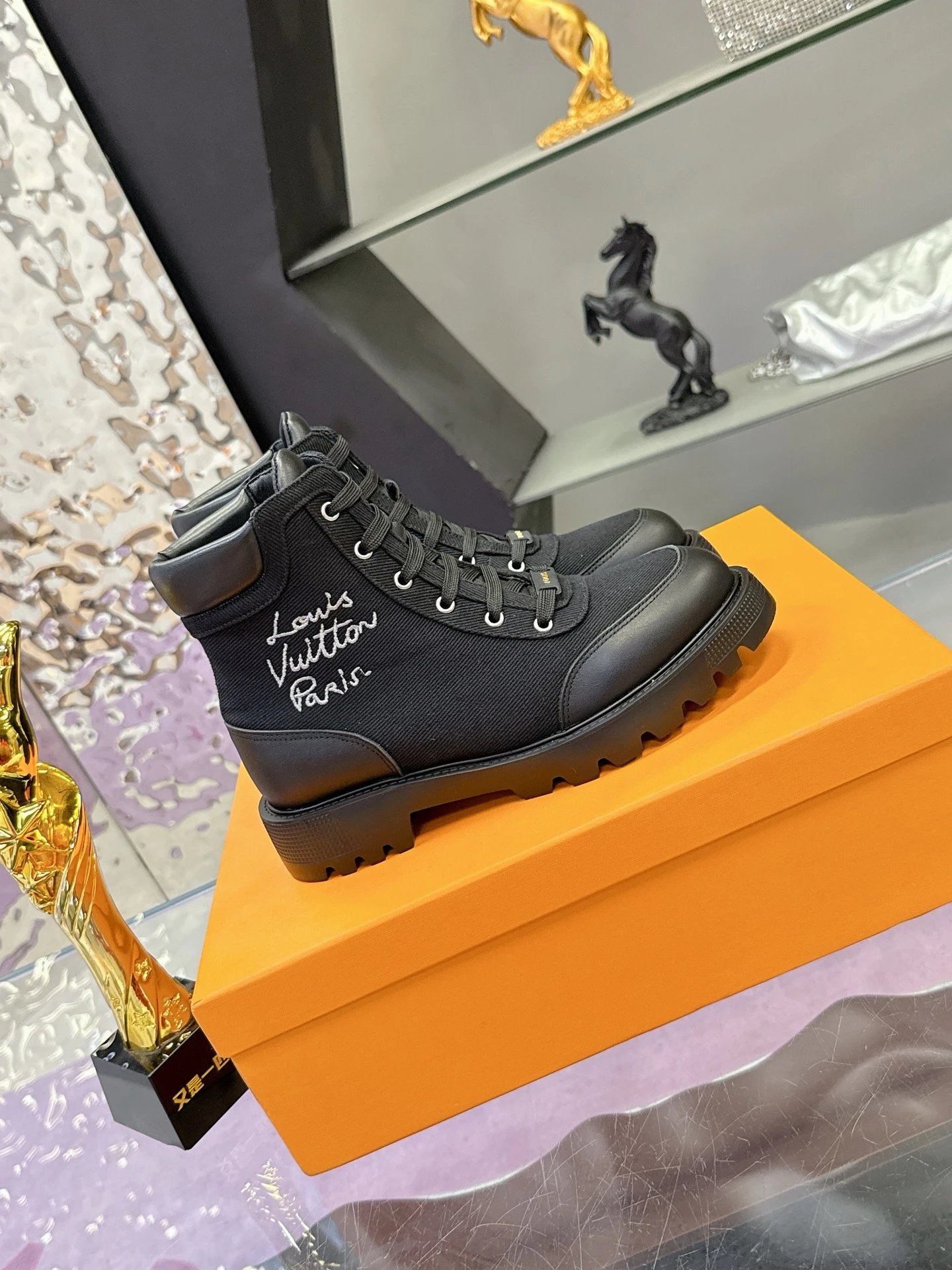 Louis Vuitton Black Work Boots blend luxury streetwear functionality with classic workwear aesthetics. Metal buckles accentuate the silhouette, while the thick, slip-resistant sole ensures practicality. Pair effortlessly with workwear pants or jeans for instant street-style flair. Perfect for everyday outings and trendy occasions, these versatile boots feature signature LV texture—an essential piece for the workwear revival season.