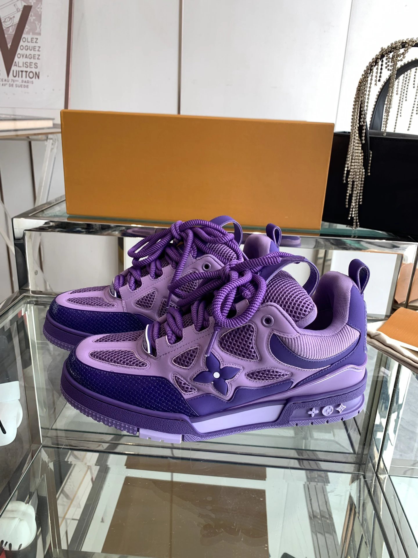 LV Trainer Purple Sneakers blend retro athletic vibes with a high-saturation purple hue, while the classic Monogram pattern subtly hints at luxury. Pair them with denim shorts, an oversized hoodie, or a functional jacket to instantly unlock a street-chic look. A celebrity-approved style and a favorite among high-street icons, these sneakers feature a comfortable cushioned sole. A must-have for turning heads this fall/winter, effortlessly balancing fashion-forward flair and practicality.