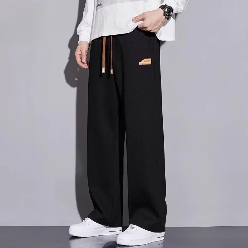 Pants Street Flow Black High-Street Relaxed Straight-Leg Casual Pants. The drawstring waist features a brown leather adjustment buckle and metal bell pull. Side flat patch pockets blend functionality with style, while a leather patch at the back waist adds a subtle brand detail. Crafted from a premium cotton-blend fabric with a drapey finish, it offers structure without wrinkling. The relaxed straight-leg cut flatters the silhouette, creating a natural, flowing drape with every step. Classic black adapts to diverse styling scenarios, effortlessly pairing with hoodies, jackets, or oversized shirts. Combining comfort and trendiness, these versatile pants become streetwear enthusiasts’ go-to for everyday outings, embodying a carefree high-street attitude.