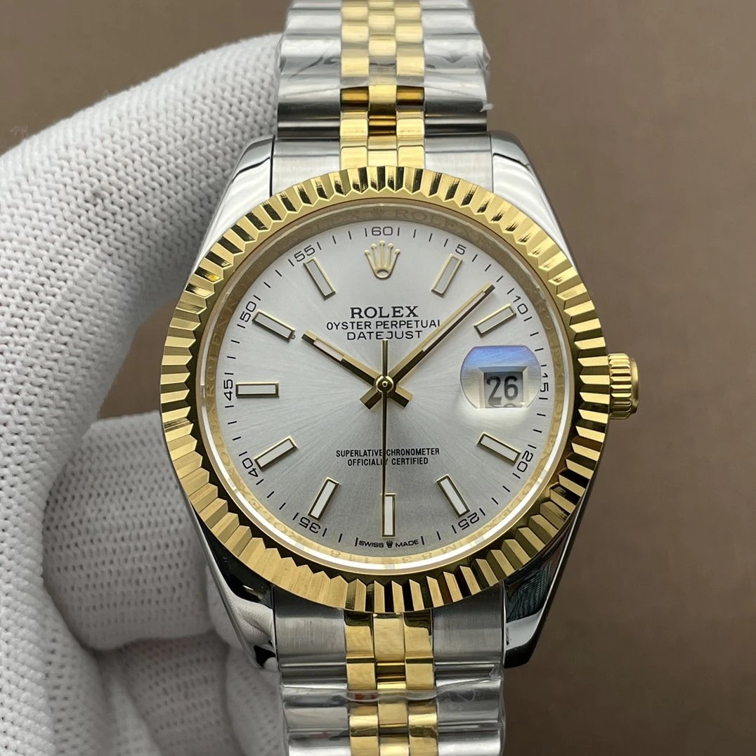 Rolex Datejust Classic Two-Tone White Watch: The two-tone bezel contrasts with the pristine white dial, blending classic Oyster design with modern understated luxury. Pair it with a simple T-shirt for sharp everyday wear or with a suit for refined business occasions. It embodies understated sophistication amid the retro revival, a timeless classic that never goes out of style.