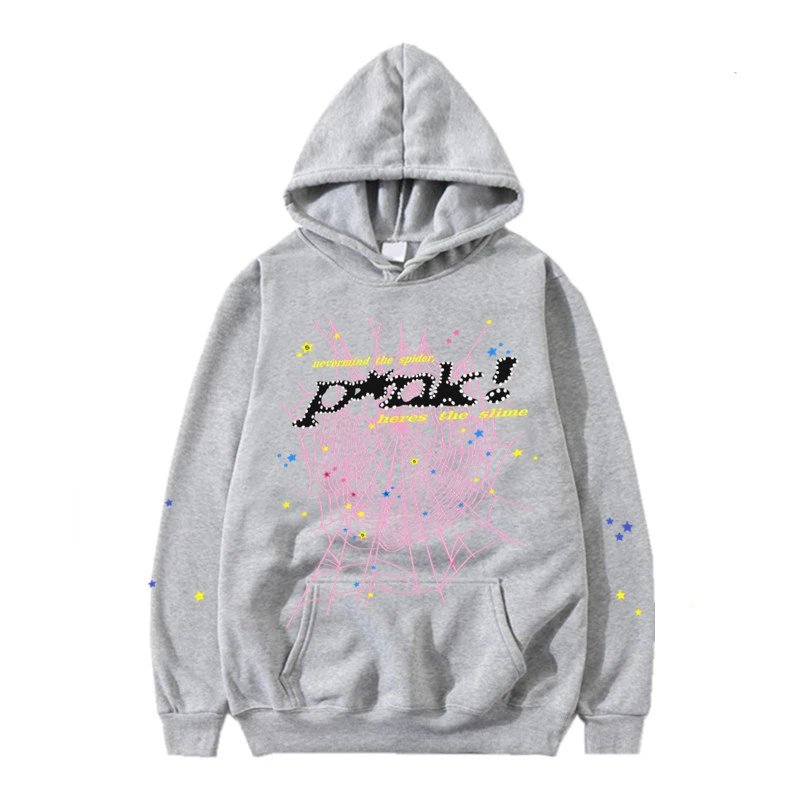 SP5DER’s Spider Web Series hoodie blends streetwear chic with a gray base, featuring pink spider web patterns, black lettering, and colorful star accents. Crafted from premium cotton terry fabric, it offers softness, warmth, breathability, and everyday versatility.
