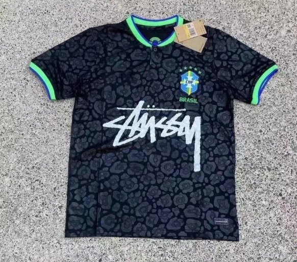 Stussy Brasil Collection Black Streetwear Athletic Jersey. A deep black base features an all-over subtle camouflage pattern for understated coolness, while contrasting green and blue ribbing at the collar and cuffs inject vibrant details. The bold white Stussy handwritten graffiti logo on the chest boldly declares the brand’s attitude, and the “BRASIL” lettering on the left sleeve patch echoes the collection’s theme. Classic brand elements are subtly hidden within the camouflage pattern, revealing thoughtful design in the details. Crafted from breathable, quick-dry athletic fabric, it balances comfort with streetwear style, effortlessly transitioning from daily outings to fashion gatherings. As a creative fusion of Stussy and football culture, this jersey’s unique design and retro athletic aesthetic have made it a coveted staple in streetwear enthusiasts’ wardrobes, maintaining high visibility within the fashion scene.