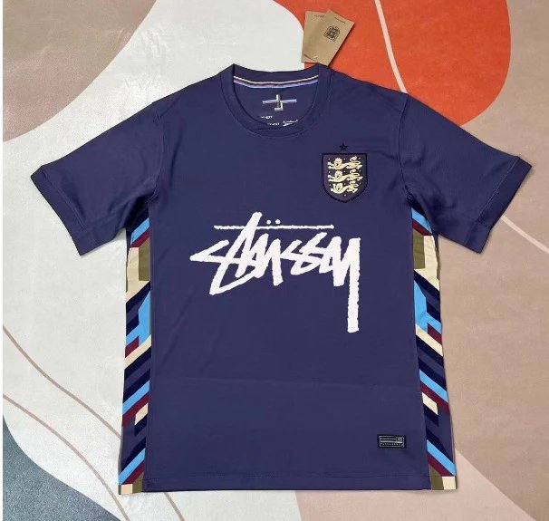Stussy England Crest Graffiti Series Dark Blue Street Sportswear Jersey. The iconic white Stussy graffiti logo on the chest commands attention, while the England crest emblem adds vintage athletic character. Color-blocked stripes along the sides break monotony, injecting dynamic layers. The crew neckline hugs the neckline, while breathable athletic fabric ensures comfortable wear for daily outings or sports activities. Blending street graffiti art with athletic wear DNA, its distinctive design and trend-setting appeal make it a coveted piece among street culture enthusiasts, effortlessly showcasing an unrestrained, trendy attitude.