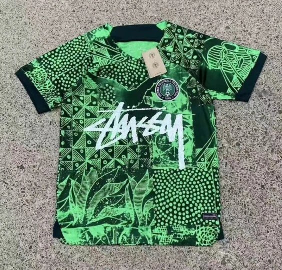 Stussy Graffiti Totem Series Neon Green Ethnic-Inspired Athletic Jersey. A deep forest green base is covered in neon green graffiti totems, blending geometric diamonds, polka dots, and botanical textures for richly layered patterns. The bold white handwritten “Stussy” logo on the chest stands out, paired with black ribbed collar and cuffs for a clean silhouette. A circular patch on the left chest adds vintage athletic detailing. Crafted from breathable athletic fabric, it stays cool and sweat-free in summer heat. The collision of street graffiti’s laid-back edge and ethnic totems’ artistic tension makes this a standout choice for summer outings, effortlessly showcasing individual attitude.
