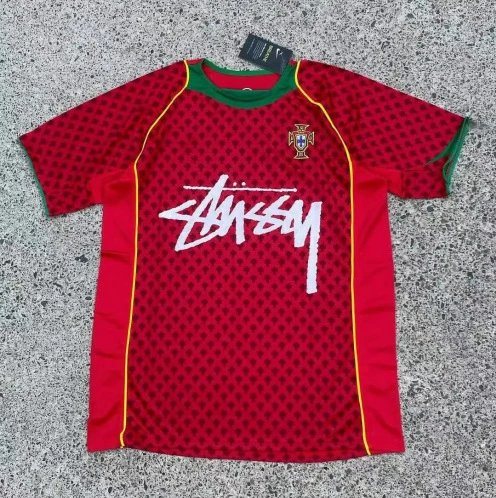 Stussy Street Sports Collection Portugal Emblem Polka Dot Contrast Jersey Short-Sleeve Shirt. Featuring a bold red base with contrasting green crew neck and yellow side stripes, the garment is covered in a dense polka dot pattern. The classic handwritten logo on the chest is bold and eye-catching, while the Portuguese cross emblem on the left chest injects retro flag elements. Crafted from breathable mesh fabric, its athletic cut balances comfort with sharp lines, fusing street graffiti artistry with football heritage. This piece, blending regional culture with streetwear identity, becomes an eye-catching choice for both everyday streetwear and athletic settings, effortlessly showcasing an unconventional fashion attitude.