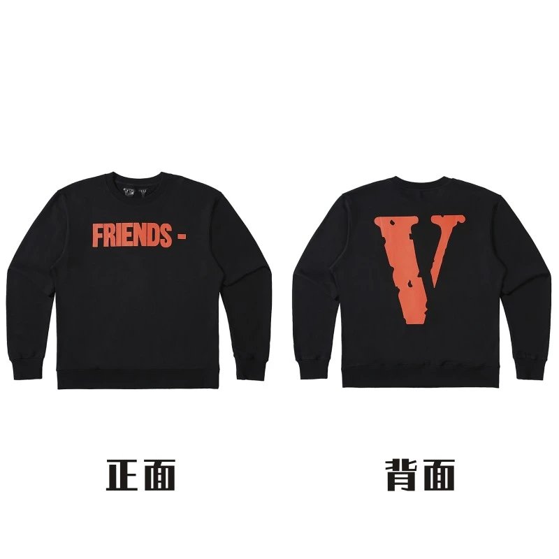 Vlone’s classic graphic hoodie series embodies American streetwear style. The black version offers minimalist individuality. The bold orange “FRIENDS -” lettering on the front and the signature torn V-pattern on the back make a statement, showcasing street attitude. Crafted from premium cotton terry fabric, it’s soft, breathable, and comfortable to wear. As a highly sought-after item among trendsetters, it garners praise for its unique prints and premium materials, making it a popular choice for everyday autumn/winter streetwear and fashionable pairings.